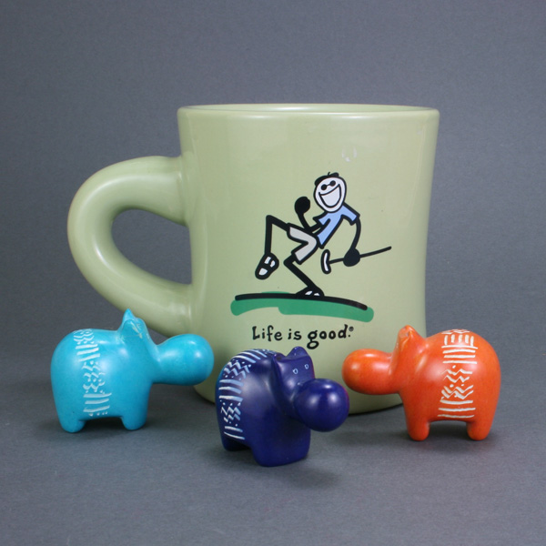 Soapstone or Kisii stone asit is known locally is quarried near the town of Tabaka in W. Kenya. After selecting the right stone for the job, Paul then carves out the hippo using a machette, adze & finally a small knife for the detailed work. After it has been sanded smooth it is passed on to Julius who dyes each hippo to the desired color and adds an incised design if needed.