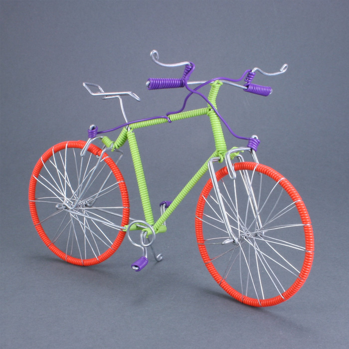 These racing bikes are supplied by two producers, Peter and Abel who also make the telephone wire rings and Tav's group, who I've been working with for the past two years. Both groups are from Johannesburg, S. Africa. Telephone wire is wrapped around a galvanized wire frame to make this cute model.