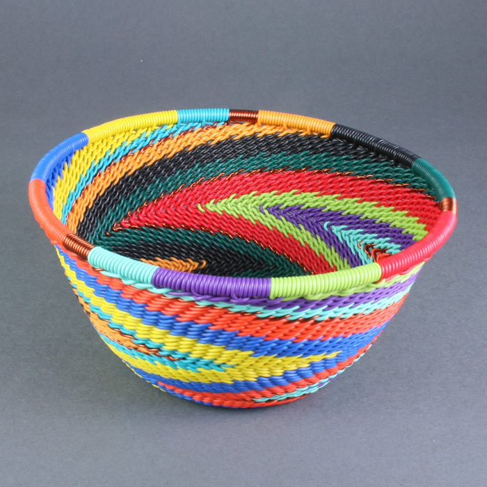 These bowls are designed and made by the Zulu people of South Africa. This is a traditional weaving technique originally using palm fiber. Years ago someone had the bright idea of weaving with brightly colored telephone wire. Although colors will remain constant the design on each bowl is unique with the artist having complete control over their work.