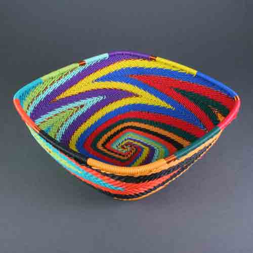 These bowls are designed and made by the Zulu people of South Africa. This is a traditional weaving technique originally using palm fiber. Years ago someone had the bright idea of weaving with brightly colored telephone wire. Although colors will remain constant the design on each bowl is unique with the artist having complete control over their work.