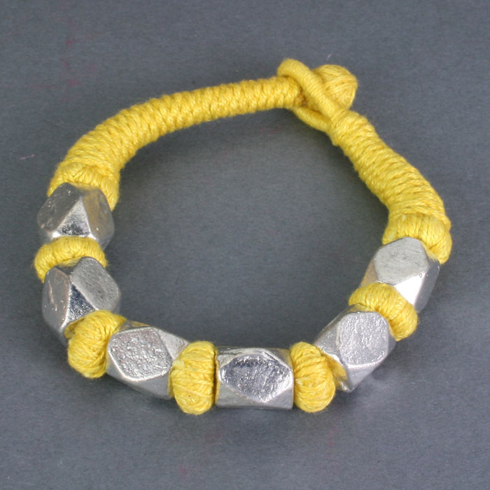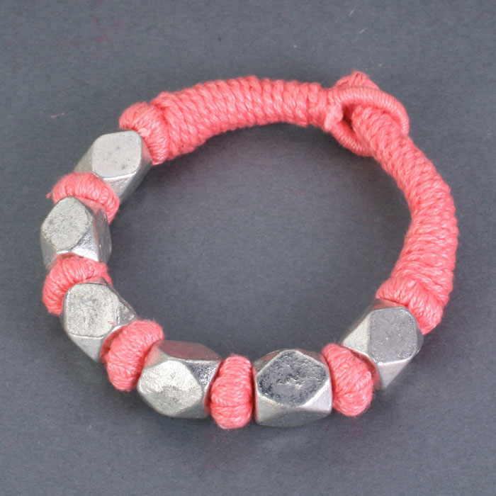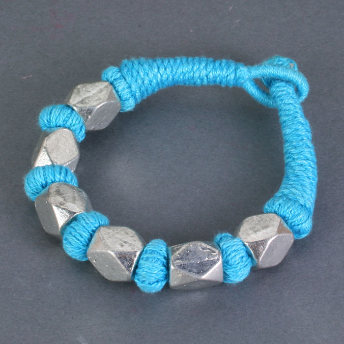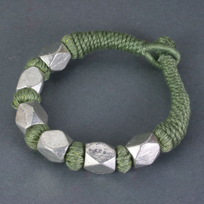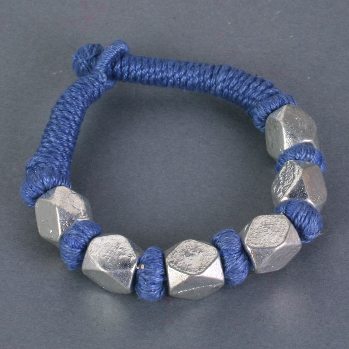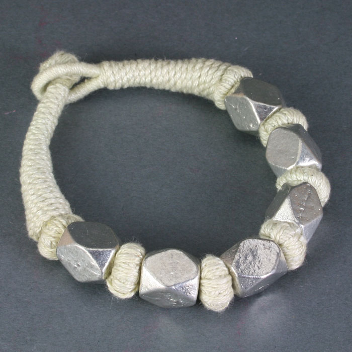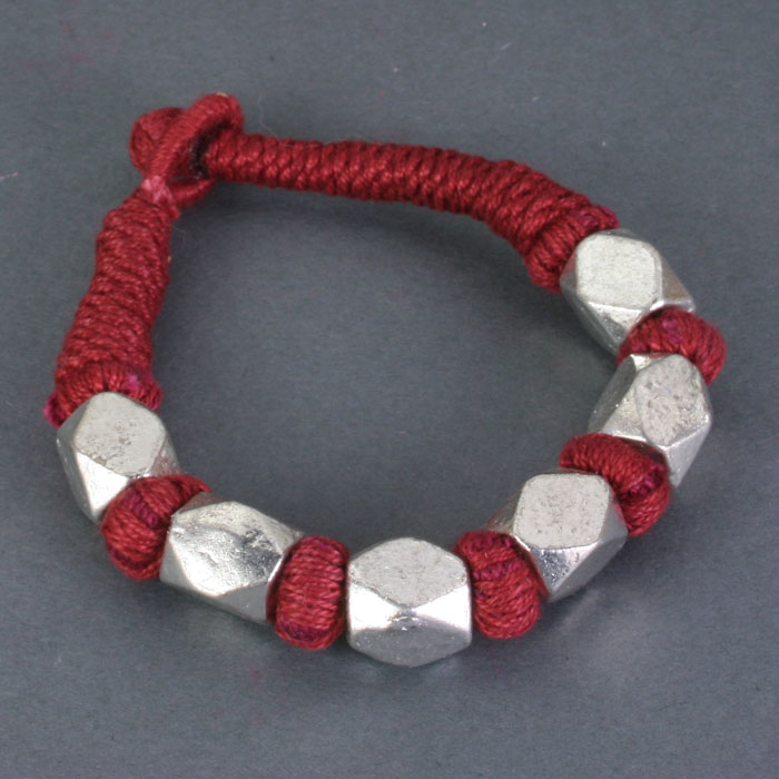 These bracelets are made in the Ragastan area of Northern India.  Cotton and white metal are combined to give this bracelet a polished look.